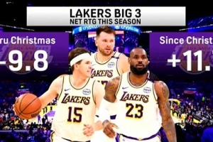 體育資訊3月3日訊 今日,電視節目《First Thing First》曬出一組湖人三巨頭東契奇、詹姆斯、里夫斯的同場凈效值數據對比。