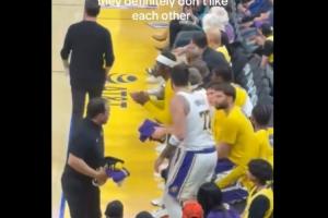 雷迪克追著東契奇到了板凳席末端,跟東契奇吵了兩句就轉身離開,東契奇看起來非常生氣,站了起來并且想追上去找雷迪克對質,被范德比爾特站在中間攔住,東契奇轉身后,可以看到他的表情非常憤怒。