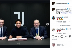 尤文官方宣布,麥肯尼與俱樂(lè)部續(xù)約至2030年。麥肯尼社媒曬出簽署新合同的照片,配文:“再開(kāi)心不過(guò)啦!又簽了4年。”