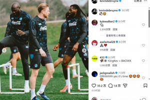 德布勞內(nèi)肌肉受傷接受手術(shù),自去年10月25日以來(lái)一直缺席。現(xiàn)在德布勞內(nèi)已經(jīng)恢復(fù)訓(xùn)練,他在社交媒體上曬出訓(xùn)練照片,并配上笑臉的表情符號(hào)。