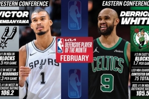 體育資訊3月4日訊 今日NBA官方宣布,馬刺球星文班亞馬和凱爾特人球員德里克·懷特分別被評為西部和東部二月份最佳防守球員。
