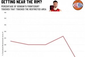 申京各個賽季在前場拿球時禁區觸球占比,本賽季僅16.6%,創生涯新低