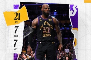 賽后湖人官方發布詹姆斯和東契奇本場數據海報,詹姆斯砍下21分7籃板7助攻,東契奇砍下27分10籃板7助攻。