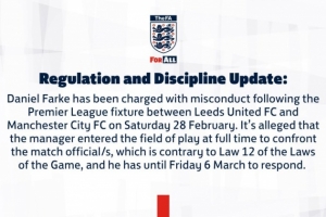 規章與紀律公告:“在2月28日周六利茲聯與曼城的英超比賽結束后,法爾克因不當行為被正式指控。”