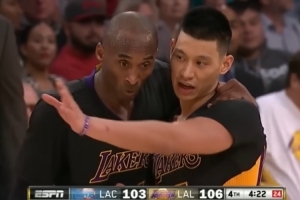 GIF-名場面—2014年11月湖人對快船,林書豪叫科比過來幫忙擋拆,面對保羅投進高難度三分