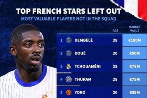 體育資訊11月14日訊 德國轉會市場統計了無緣本期法國隊名單球員的身價,并列出榜單,登貝萊1億歐居首。