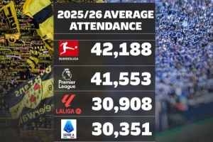 體育資訊3月5日訊 德甲統(tǒng)計了本賽季歐洲聯(lián)賽的場均上座人數(shù),并列出榜單,德甲居首,英超、西甲二三位,德乙排名第5位。