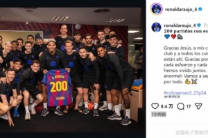 阿勞霍此役為巴薩替補出場,這是他為巴薩出戰(zhàn)的第200場比賽,阿勞霍獲贈紀(jì)念球衣,他在社媒曬出與全隊的合照,并寫道:“身穿巴薩球衣的第200場比賽。