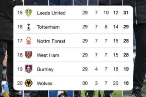 保級區方面,排名第16的熱刺29分,只領先第17的森林1分。目前在降級區的三支球隊:西漢姆28分(與森林同分),伯恩利19分,狼隊16分。