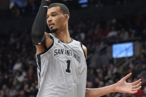 賽后,斯圖爾特接受了記者采訪。談到文班亞馬,他說道:“他是個高個子,占了很大的空間。我們必須更好地調動他,直接沖擊他的胸部(playing straight through his chest)。這對我們有幫助,也是他的弱點所在,當防守者沖向他的胸部時(when he’s got defenders going at his chest),他會掙扎?!?/p>