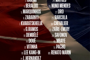 前鋒:7-克瓦拉茨赫利亞、9-貢薩洛·拉莫斯、10-登貝萊、14-杜埃、29-巴爾科拉、49-姆巴耶