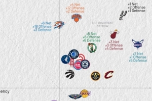 體育資訊3月6日訊 今天,美媒Kirk Goldsberry曬圖統計了NBA過去10場比賽所有球隊的攻防效率,詳情入下: