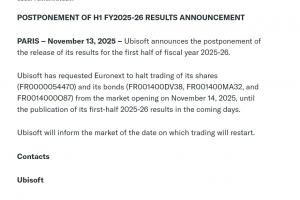 體育資訊11月14日訊?據外媒報道,育碧今日突然發布公告,宣布推遲最新財報的公布,并且暫停了股票和債券的交易。具體公布財報時間和恢復交易時間待定。