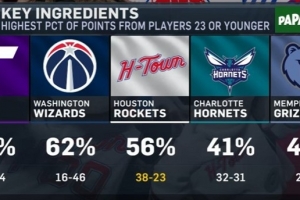 火箭主場迎戰(zhàn)開拓者,轉(zhuǎn)播方曬出本賽季23歲及以下球員得分占球隊總分比重最高的五支球隊,分別是: