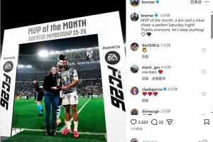 布雷默當選尤文2月份最佳球員,賽前他領取了獎杯,賽后布雷默社媒曬出領獎照片,并寫道:“月最佳球員、勝利和零封,一個完美的周六之夜!感謝所有人,讓我們繼續加油!”