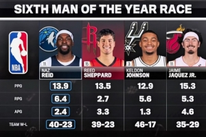 納茲·里德 球隊(duì)?wèi)?zhàn)績(jī)40勝23負(fù) 場(chǎng)均13.9分6.4籃板2.4助攻