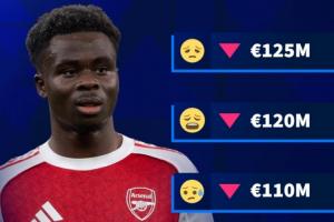 體育資訊03月08日訊 德轉明天將更新英超球員身價,它們今天預熱了薩卡身價將在更新后下跌,最低將跌至1億歐。