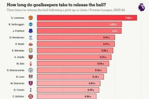 本賽季英超門將在撿球或接球后的出球時間(從慢到快排列)