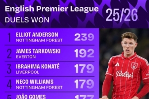 本賽季英超對抗成功次數排名: