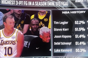 湖人VS尼克斯,轉播方曬肯納德數據,本賽季肯納德三分命中率已經來到50.3%,能排進NBA單賽季歷史前五(至少出手175次及以上):