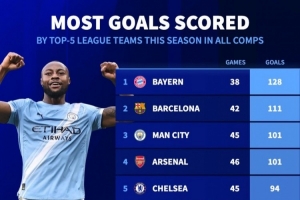 本賽季五大聯(lián)賽球隊(duì)進(jìn)球榜(所有賽事):