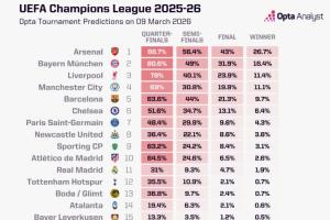 OPTA預測比賽歐冠奪冠概率