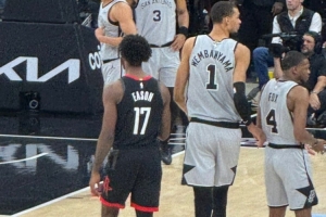在本場比賽中,伊森三次吃帽,其中兩次是被文班蓋掉;伊森媽媽更推道:“伙計們,我看出來了。那個男孩(伊森、2米03)在文班亞馬(2米24)跟前看起來只有1米55(5英尺1英寸),他(文班亞馬)一掌把我兒子扇回非洲了??。”
