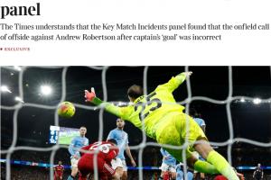 體育資訊11月14日訊 誤判!泰晤士:專家組裁定,范戴克對曼城進球應判有效