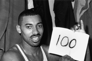 “最后一分鐘,羅杰斯傳給張伯倫,張伯倫射失;泰德·盧肯比爾抓到籃板球再給張伯倫,再射失;盧肯比爾繼續抓到籃板,傳球給盧克里克,盧克里克將球傳到張伯倫手里。比賽還有46秒,張伯倫高高跳起,球進籃筐,100分?!?/p>