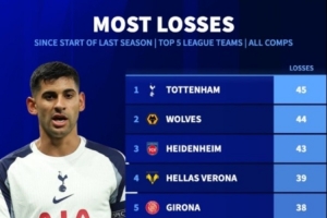 體育資訊3月11日訊 根據德轉統計,熱刺是上賽季以來五大聯賽輸球最多的球隊,各項賽事一共輸掉45場。