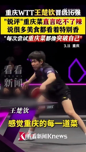 體育資訊03月12日訊 2026年WTT重慶冠軍賽男單1/16決賽,王楚欽3-0擊敗格羅特,順利晉級16強。賽后他接受采訪,談到重慶的美食。