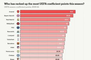 體育資訊03月14日訊 The Athletic統計了歐洲聯賽俱樂部本賽季目前為止掙得的歐足聯系數積分,阿森納以30.5分領跑,拜仁、皇馬、中日德蘭、巴黎位列前五。