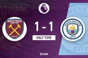 上半場傷停補時2分鐘,半場結束,曼城暫1-1西漢姆聯。