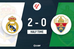 第39分鐘,皇馬禁區(qū)前沿獲得任意球機會,巴爾韋德大力抽射,球被門將撲出,隨后埃爾切球員解圍沒頂遠,呂迪格迎球抽射打進,皇馬1-0領先!↓