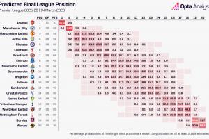 據OPTA利用超級計算機進行的10000次模擬,阿森納奪得英超冠軍的概率為97.6%,曼城奪冠概率為2.4%。