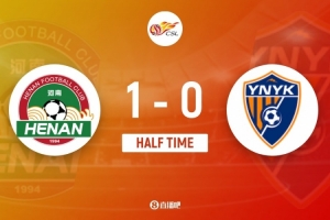 傷停補時3分鐘。上半場比賽結束,河南1-0云南玉昆。