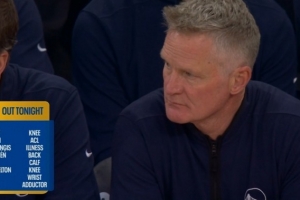 比賽中,轉播方曬出了勇士的傷病名單,以下球員今天都不能出戰:
