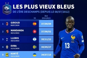 體育資訊11月15日訊 世預(yù)賽歐洲區(qū)比賽,坎特踢滿全場,幫助法國主場4-0擊敗烏克蘭,德轉(zhuǎn)列出了德尚執(zhí)教法國隊以來年齡最大出場球員排名,吉魯居首,坎特排在第5位。