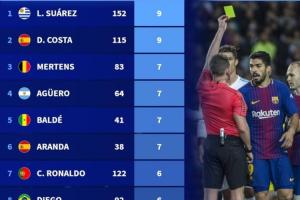 體育資訊03月16日訊 德轉盤點前10聯賽中,球員在各項賽事假摔染黃次數榜,蘇亞雷斯和迭戈·科斯塔9黃并列第一,C羅6黃上榜。