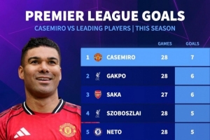 體育資訊3月16日訊 英超第30輪比賽,卡塞米羅破門,曼聯(lián)主場(chǎng)3-1擊敗維拉。德國(guó)轉(zhuǎn)會(huì)市場(chǎng)統(tǒng)計(jì)了卡塞米羅與部分頂級(jí)球員本賽季英超的進(jìn)球數(shù)量。