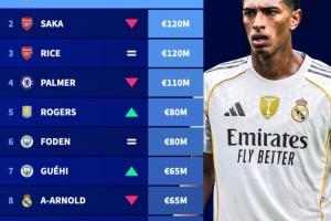 體育資訊3月16日訊 在公布了新一期的西甲球員身價情況后,德國轉會市場盤點了英格蘭球員身價top10,貝林厄姆以1.4億歐居首,阿森納兩將薩卡和賴斯以1.2億歐并列次席。