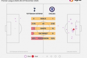 體育資訊11月2日訊 英超第10輪比賽,熱刺在主場以0-1的比分不敵切爾西。本場比賽,熱刺的預期進球數僅為0.05。
