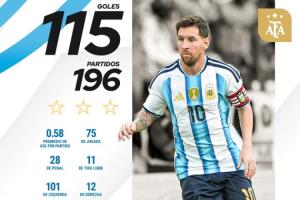 梅西國家隊生涯196場打進115球,仍居國家隊歷史射手榜第二,榜首C羅143球。