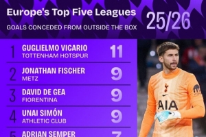 體育資訊3月17日訊 Squawka統(tǒng)計(jì)了本賽季門將在五大聯(lián)賽禁區(qū)外失球的數(shù)量,并列出榜單,維卡里奧11球最多。