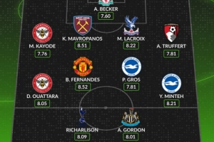 后衛(wèi):卡約德(布倫特福德)、馬夫羅帕諾斯(西漢姆)、拉克魯瓦(水晶宮)、特呂費(fèi)爾(伯恩茅斯)