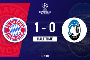 上半場補時3分鐘。半場戰罷,拜仁1-0亞特蘭大。