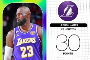 本場比賽,湖人球星詹姆斯上場34分鐘,14投13中得到30分5籃板2助攻1搶斷1蓋帽。詹姆斯本場的投籃命中率高達92.9%,追平生涯最高紀錄。