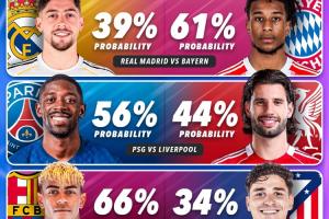 體育資訊03月19日訊 歐冠八強已經(jīng)全部產(chǎn)生,外媒Score90根據(jù)相關(guān)機構(gòu)賠率,列出了各隊晉級四強的概率。在1/4決賽中四組對陣中,拜仁、巴黎、巴薩、阿森納擁有更高的晉級概率。