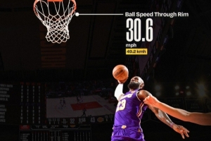 根據統計,詹姆斯的這記勢大力沉的扣籃起跳距離為3.2米,籃球穿越籃筐的速度為49.2公里/小時。