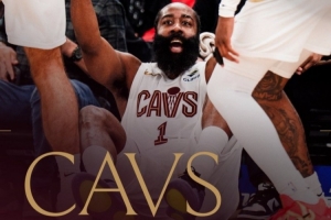 賽后球隊(duì)發(fā)布哈登海報(bào)慶祝勝利,畫(huà)面為哈登坐在地上被隊(duì)友拉起瞬間。